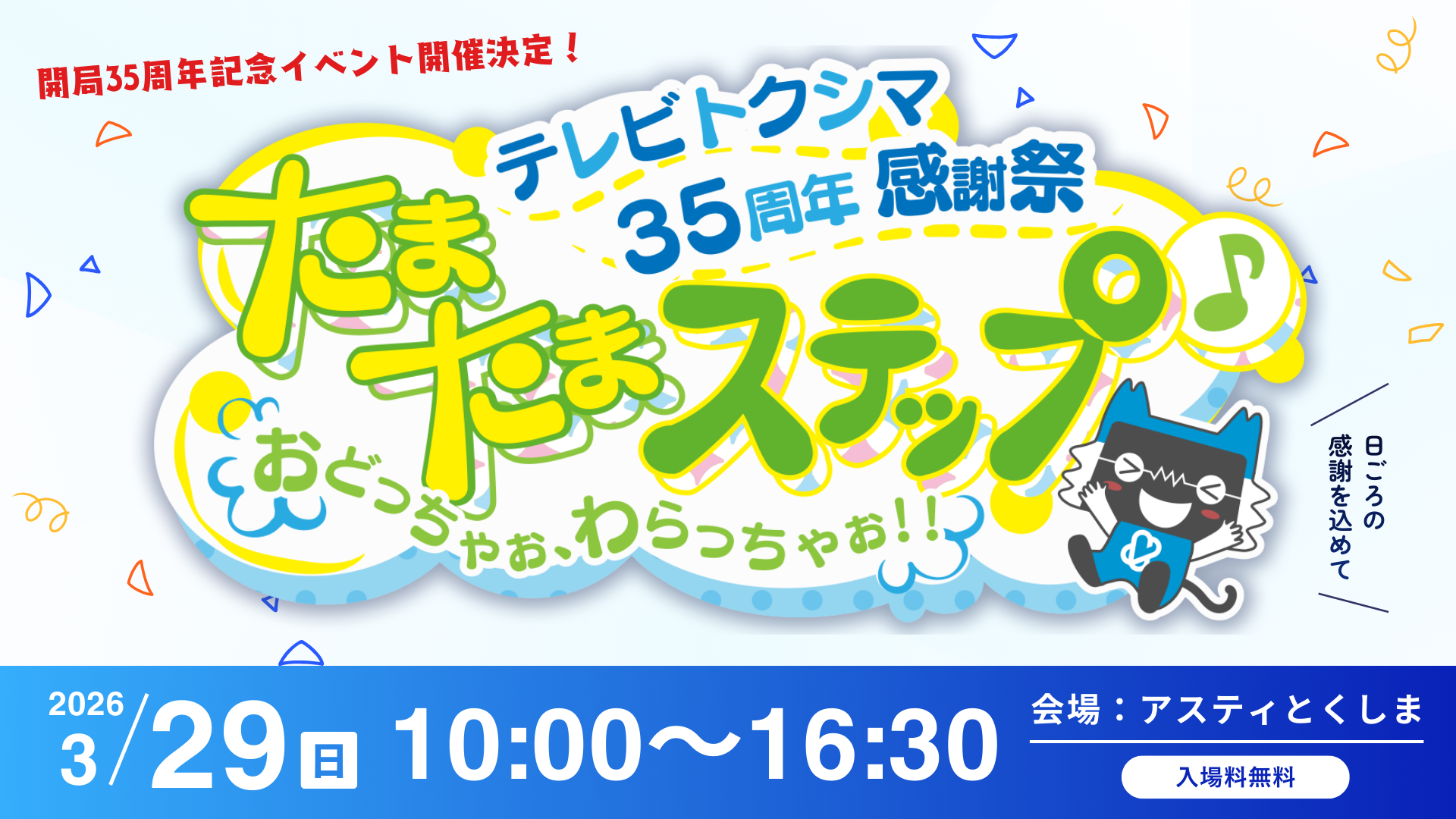 加入をご検討中の方 サービス提供エリア サービスのご案内 料金シミュレーションお申込み よくあるご質問 ご利用中のお客様 マイページ 各種お問い合わせ 加入者プレゼント よくあるご質問 今月のイチ押し 毎週 月・水・金曜12時~生放送 ステップ 1/19(月)9時、1/25(日) 16時ほか 四国大学吹奏楽部 第40回定期演奏会 1/21(水)9時~、1/23(金)14時~ほか 徳島商業高校吹奏楽部 第48回定期演奏会 その他の番組 最新情報 2026/1/13 お知らせ ~ テレビトクシマ 35周年 感謝祭 ~ 『たまたまステップ♪ おどっちゃぉ、わらっちゃぉ!!』開催のお知らせ 2026/1/8 メンテナンス情報 ライブカメラチャンネル(112ch)メンテナンスのお知らせ 2026/1/8 メンテナンス情報 設備メンテナンスによるテレビサービス停止のお知らせ 2026/1/5 お知らせ 料金ご請求日のお知らせ 2025/12/22 お知らせ 「古着deワクチン」イベントについて(2025年11月20日から12月11日) 一覧へ